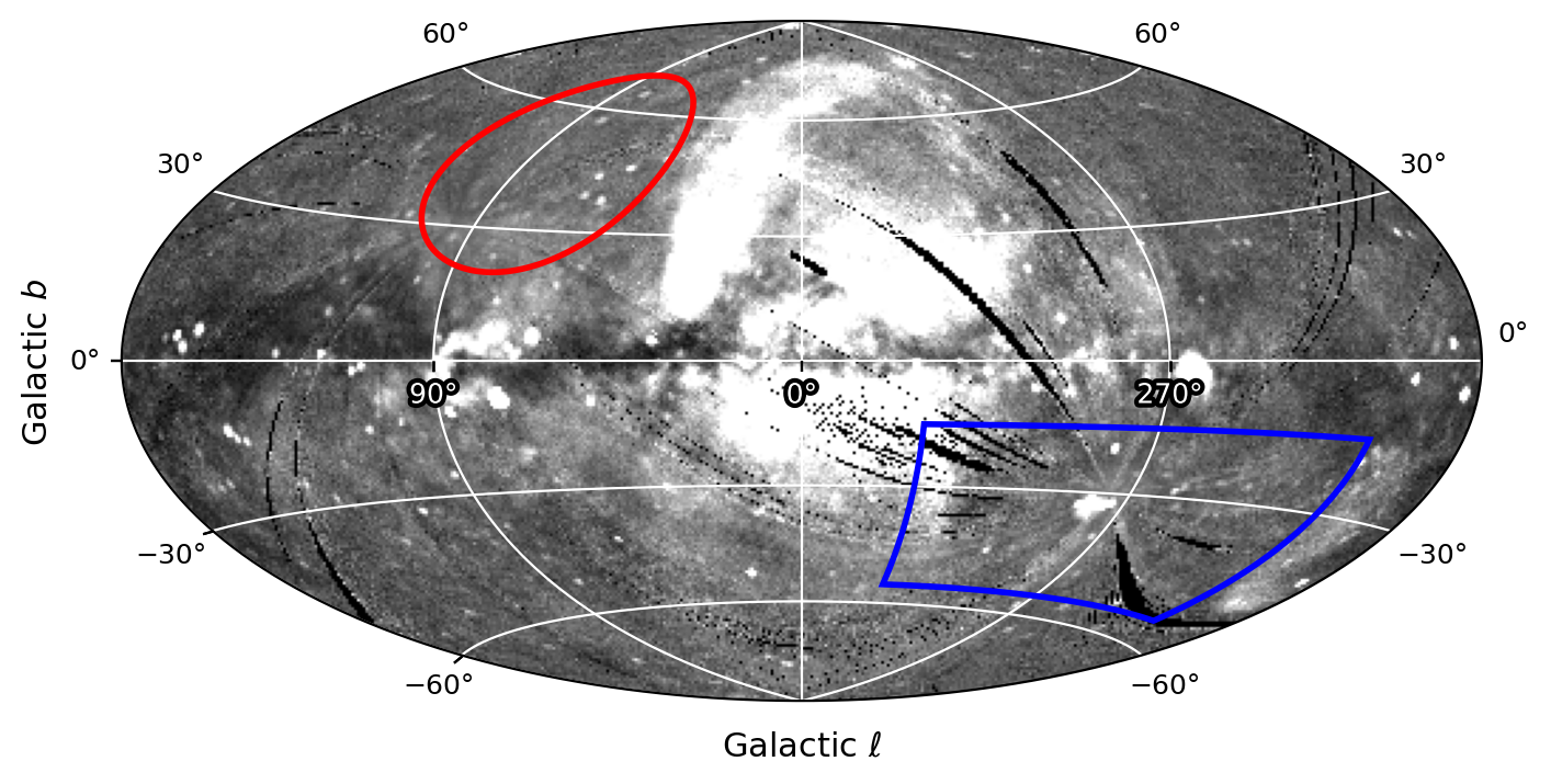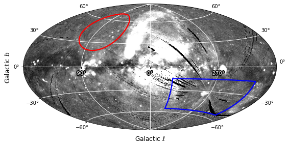 The next example demonstrates how to plot spherical regions (e.g., a circle and a longitude/latitude “range”) on a full sky image (seen in the visualization demo here) using Matplotlib.
