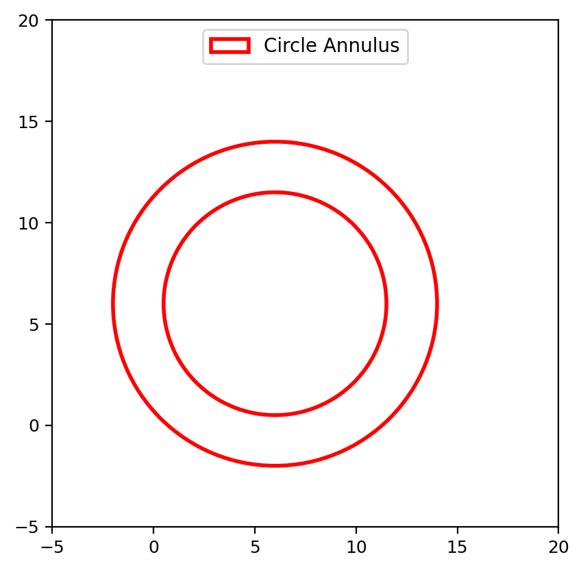 from regions import PixCoord, CircleAnnulusPixelRegion import matplotlib.pyplot as plt fig, ax = plt.subplots(1, 1) reg = CircleAnnulusPixelRegion(PixCoord(x=6, y=6), inner_radius=5.5, outer_radius=8.0) patch = reg.plot(ax=ax, facecolor='none', edgecolor='red', lw=2, label='Circle Annulus') ax.legend(handles=(patch,), loc='upper center') ax.set_xlim(-5, 20) ax.set_ylim(-5, 20) ax.set_aspect('equal')