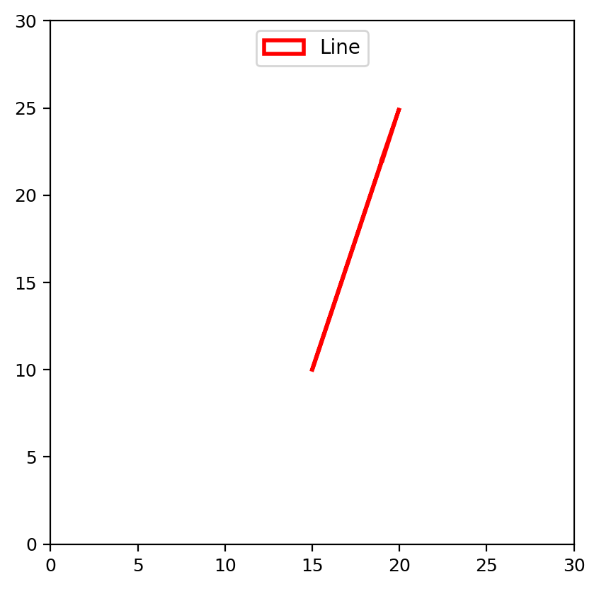 from regions import PixCoord, LinePixelRegion import matplotlib.pyplot as plt fig, ax = plt.subplots(1, 1) start = PixCoord(x=15, y=10) end = PixCoord(x=20, y=25) reg = LinePixelRegion(start=start, end=end) patch = reg.plot(ax=ax, edgecolor='red', lw=2, label='Line') ax.legend(handles=(patch,), loc='upper center') ax.set_xlim(0, 30) ax.set_ylim(0, 30) ax.set_aspect('equal')