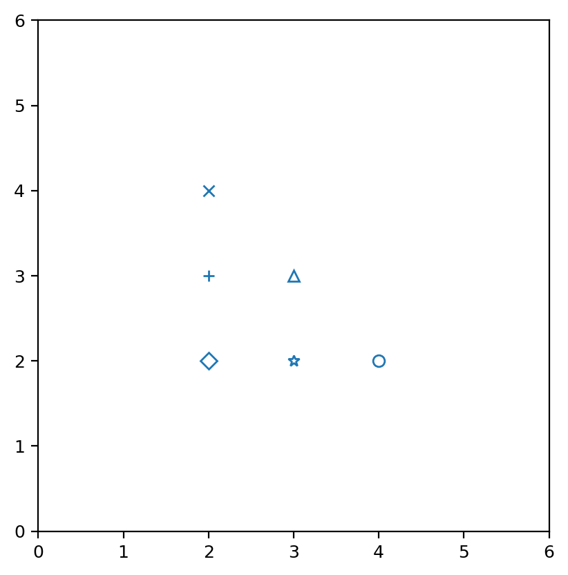 from regions import PixCoord, PointPixelRegion, RegionVisual import matplotlib.pyplot as plt fig, ax = plt.subplots(1, 1) regs = [] regs.append(PointPixelRegion(PixCoord(2, 2), visual=RegionVisual(marker='D'))) regs.append(PointPixelRegion(PixCoord(2, 3), visual=RegionVisual(marker='+'))) regs.append(PointPixelRegion(PixCoord(3, 3), visual=RegionVisual(marker='^'))) regs.append(PointPixelRegion(PixCoord(3, 2), visual=RegionVisual(marker='*'))) regs.append(PointPixelRegion(PixCoord(2, 4), visual=RegionVisual(marker='x'))) regs.append(PointPixelRegion(PixCoord(4, 2))) for reg in regs: reg.plot(ax=ax) ax.set_xlim(0, 6) ax.set_ylim(0, 6) ax.set_aspect('equal')