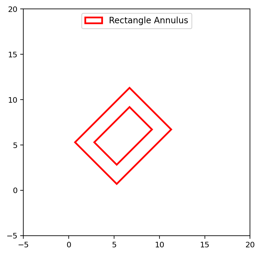 from astropy.coordinates import Angle from regions import PixCoord, RectangleAnnulusPixelRegion import matplotlib.pyplot as plt fig, ax = plt.subplots(1, 1) reg = RectangleAnnulusPixelRegion(PixCoord(x=6, y=6), inner_width=5.5, outer_width=8.5, inner_height=3.5, outer_height=6.5, angle=Angle('45deg')) patch = reg.plot(ax=ax, facecolor='none', edgecolor='red', lw=2, label='Rectangle Annulus') ax.legend(handles=(patch,), loc='upper center') ax.set_xlim(-5, 20) ax.set_ylim(-5, 20) ax.set_aspect('equal')