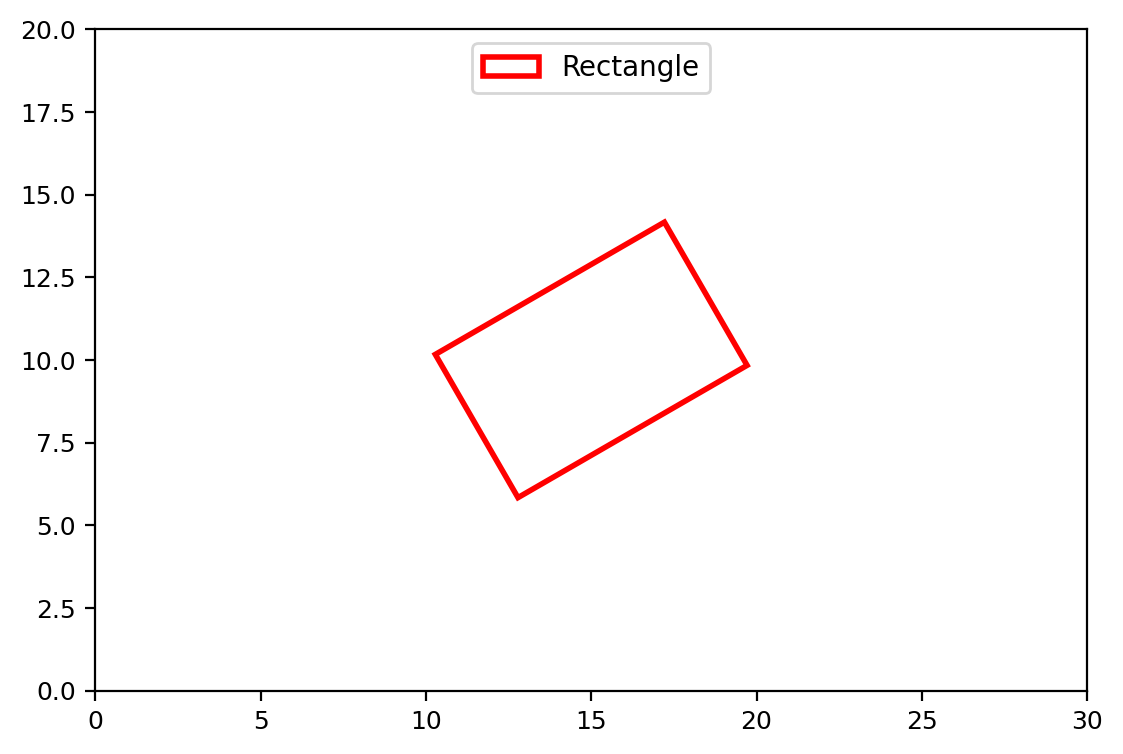 from astropy.coordinates import Angle from regions import PixCoord, RectanglePixelRegion import matplotlib.pyplot as plt fig, ax = plt.subplots(1, 1) reg = RectanglePixelRegion(PixCoord(x=15, y=10), width=8, height=5, angle=Angle(30, 'deg')) patch = reg.plot(ax=ax, facecolor='none', edgecolor='red', lw=2, label='Rectangle') ax.legend(handles=(patch,), loc='upper center') ax.set_xlim(0, 30) ax.set_ylim(0, 20) ax.set_aspect('equal')